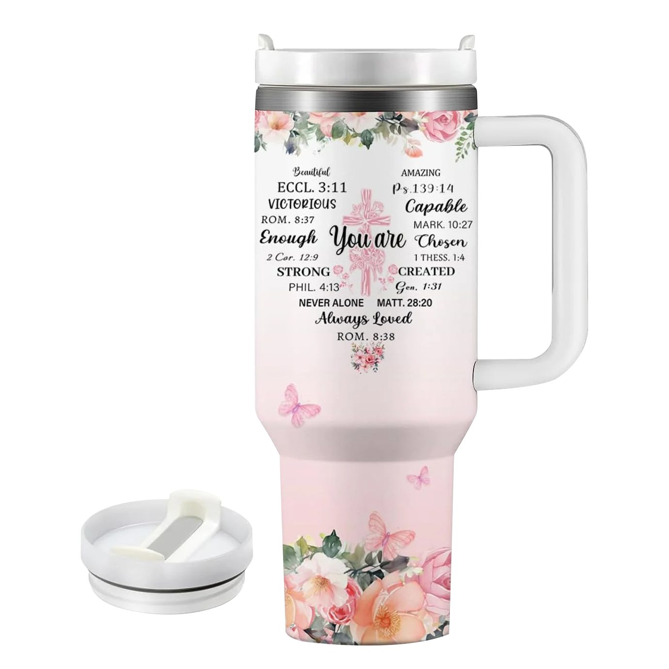 Celebrate faith with timeless designs. Each tumbler embodies Innocence, Love, and Courage—bringing meaning and elegance to your everyday moments.