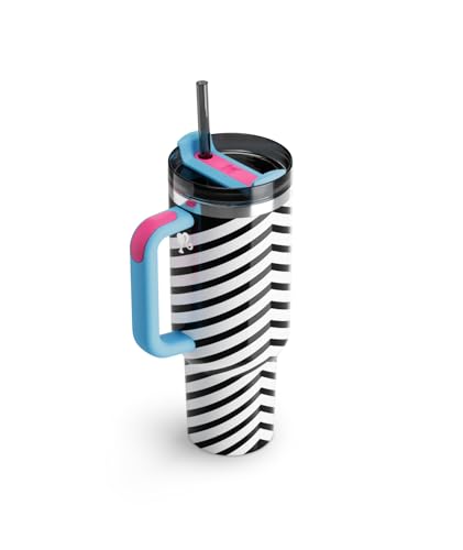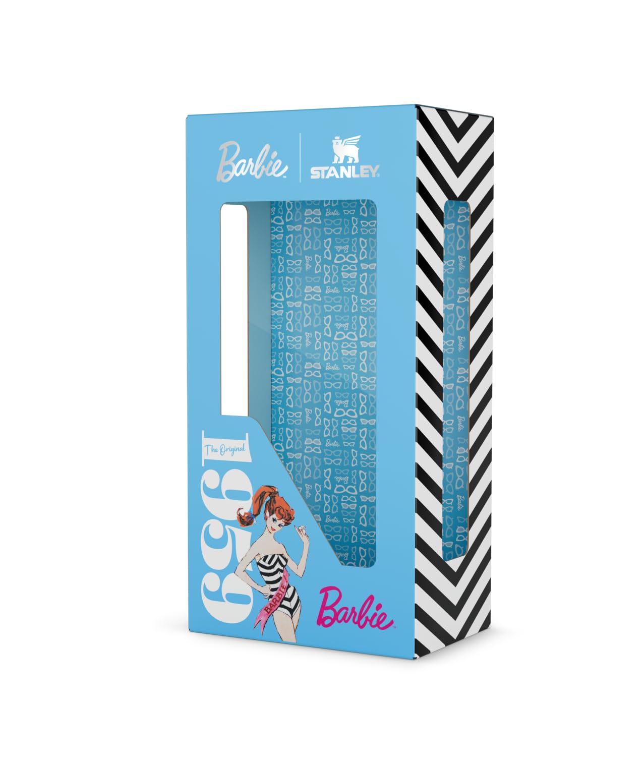 Celebrate Barbie’s timeless style with this limited edition Icon Quencher featuring a bold black-and-white chevron print, inspired by the original Barbie doll’s vintage swimsuit. Accented with vibrant pool blue and hot pink details, this tumbler also features a playful nod to Barbie’s iconic cat-eye sunglasses.